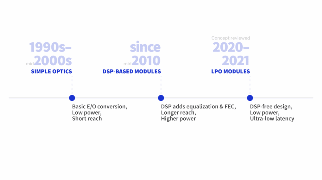 DSP-enabled modules: to address all the challenges that came with the old simple optics, like signal loss, dispersion and crosstalk, vendors introduced modules with integrated digital signal processors (DSPs). However, the trade-offs with DSP include increased power consumption, higher heat output, and added latency.