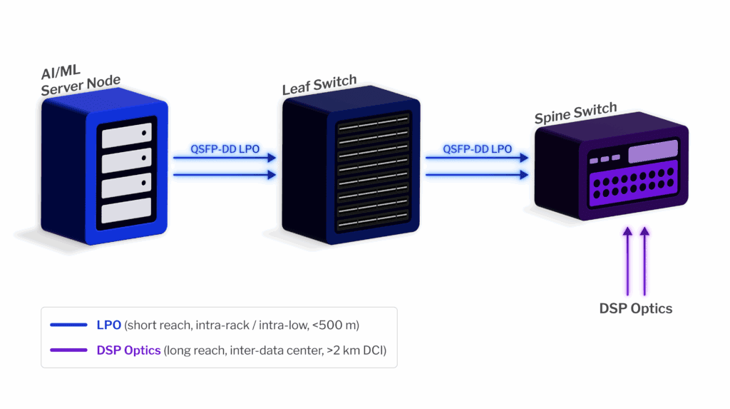 With the traditional DSP-based technology, modules remain versatile and reliable, but they come at the cost of higher power usage, added latency, and heat generation. This has given rise to Linear Pluggable Optics (LPO). A simplified, DSP-free approach that prioritizes efficiency and low latency, making it particularly attractive for short-reach, high-density deployments such as AI training fabrics and data center interconnects.